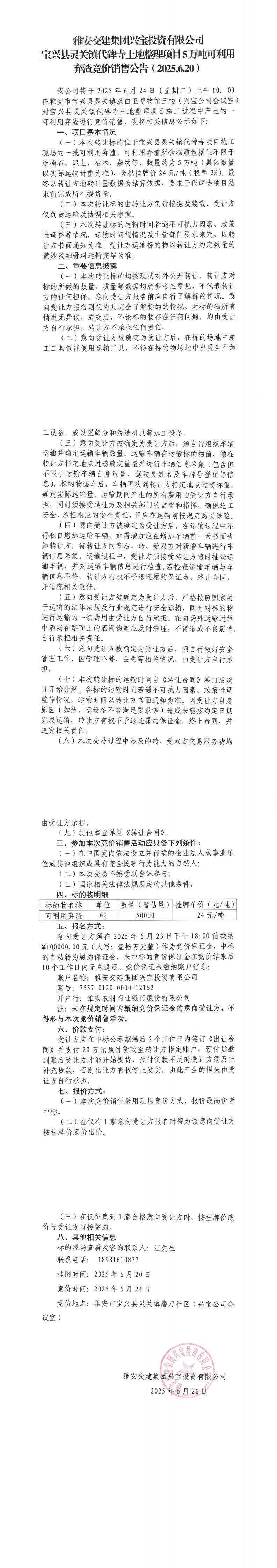 雅安交建集團興寶投資有限公司寶興縣靈關鎮(zhèn)代碑寺土地整理項目10萬噸可利用棄渣競價銷售公告